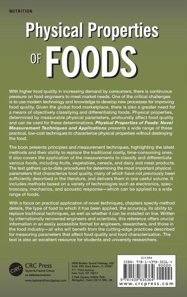 With higher food quality in increasing demand by consumers, there is continuous pressure on food engineers to meet market needs. One of the critical challenges is to use modern technology and knowledge to develop new processes for improving food quality. Given the global food marketplace, there is also a greater need for a means of objectively classifying and differentiating foods. Physical properties, determined by measurable physical parameters, profoundly affect food quality and can be used for these determinations. Physical Properties of Foods: Novel Measurement Techniques and Applications presents a wide range of these practical, low-cost techniques to characterize physical properties without destroying the food. The book presents principles and measurement techniques, highlighting the latest methods and their ability to replace the traditional costly, time-consuming ones. It also covers the application of the measurements to classify and differentiate various foods, including fruits, vegetables, cereals, and dairy and meat products. The text gathers up-to-date procedures for determining the most important physical parameters that characterize food quality, many of which have not previously been sufficiently described in the literature, and delivers them in one useful volume. It includes methods based on a variety of technologies such as electronics, spectroscopy, mechanics, and acoustic response-which can be applied to a wide range of foods. With a focus on practical application of novel techniques, chapters specify method details, the type of food to which it has been applied, the accuracy, its ability to replace traditional techniques, as well as whether it can be installed on line. Written by internationally renowned engineers and scientists, this reference offers crucial information in an easily accessible format for engineers, researchers, and those in the food industry-all who will benefit from the cutting-edge practices described for measuring parameters that affect food quality and food characterization. The text is also an excellent resource for students and university researchers.