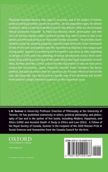 The issue of physician-assisted death is now firmly on the American public agenda. Already legal in five states, it is the subject of intense public opinion battles across the country. Driven by an increasingly aging population, and a baby boom generation just starting to enter its senior years, the issue is not going to go away anytime soon. In Physician-Assited Death L.W. Sumner equips readers with everything they need to know to take a reasoned and informed position in this important debate. The book provides needed context for the debate by situating physician-assisted death within the wider framework of end-of-life care and explaining why the movement to legalize it now enjoys such strong public support. It also reviews that movement's successes to date, beginning in Oregon in 1994 and now extending to eleven jurisdictions across three continents. Like abortion, physician-assisted death is ethically controversial and the subject of passionately held opinions. The central chapters of the book review the main arguments utilized by both sides of the controversy: on the one hand, appeals to patient autonomy and the relief of suffering, on the other the claim that taking active steps to hasten death inevitably violates the sanctity of life. The book then explores both the case in favor of legalization and the case against, focusing in the latter instance on the risk of abuse and the possibility of slippery slopes. In this context the experience of jurisdictions that have already taken the step of legalization is carefully reviewed to see what lessons might be extracted from it. It then identifies some further issues that lie beyond the boundaries of the current debate but will have to be faced sometime down the road: euthanasia for patients who are permanently unconscious or have become seriously demented and for severely compromised newborns. The book concludes by considering the various possible routes to legalization, both political and judicial. Readers will then be prepared to decide for themselves just where they stand when they confront the issue both in their own jurisdiction and in their own lives.