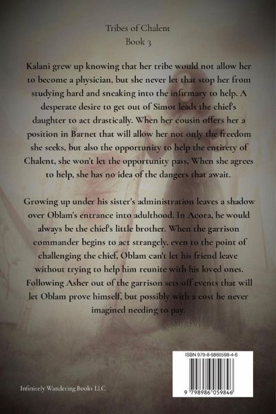 Tribes of Chalent Book 3 Kalani grew up knowing that her tribe would not allow her to become a physician, but she never let that stop her from studying hard and sneaking into the infirmary to help. A desperate desire to get out of Simot leads the chief's daughter to act drastically. When her cousin offers her a position in Barnet that will allow her not only the freedom she seeks, but also the opportunity to help the entirety of Chalent, she won't let the opportunity pass. When she agrees to help, she has no idea of the dangers that await. Growing up under his sister's administration leaves a shadow over Oblam's entrance into adulthood. In Acora, he would always be the chief's little brother. When the garrison commander begins to act strangely, even to the point of challenging the chief, Oblam can't let his friend leave without trying to help him reunite with his loved ones. Following Asher out of the garrison sets off events that will let Oblam prove himself, but possibly with a cost he never imagined needing to pay.