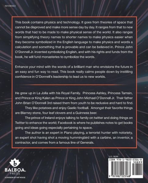 This book contains physics and technology. It goes from theories of space that cannot be disproved and make more sense day by day. It ranges from that to new words that had to be made to make physical sense of the world. It also ranges from simplifying theory names to shorter names to make physics easier when they become symbolized in the English language to make physics and words a calculation and something that is provable and can be believed in. Prince John O'Donnell Jr. invented symbolizing English, and with his rights and funds from the book, he will fund monasteries to symbolize the words. Enhance your mind with the words of a brilliant man who envisions the future in an easy and fun way to read. This book really calms people down by instilling confidence in O'Donnell's leadership to lead us to new worlds.