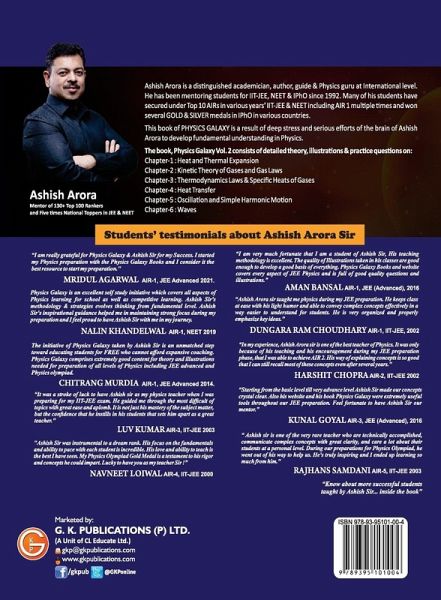 Ashish Arora is a distinguished academician, author, guide & Physics guru at International level. He has been mentoring students for IIT-JEE, NEET & IPhO since 1992. Many of his students have secured under Top 10 AIRs in various years' IIT-JEE & NEET including AIR 1 multiple times and won several GOLD & SILVER medals in IPhO in various countries. This book of PHYSICS GALAXY is a result of deep stress and serious efforts of the brain of Ashish Arora to develop fundamental understanding in Physics. The book, Physics Galaxy Vol. 2 consists of detailed theory, illustrations & practice questions on: Chapter-1: Heat and Thermal Expansion Chapter-2: Kinetic Theory of Gases and Gas Laws Chapter-3: Thermodynamics Laws & Specific Heats of Gases Chapter-4: Heat Transfer Chapter-5: Oscillation and Simple Harmonic Motion Chapter-6: Waves
