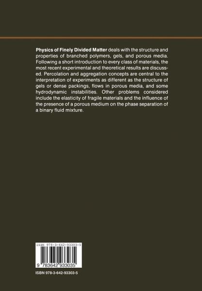I Introduction to Chemical and Physical Gels.- Covalent Macromolecular Gels.- Physical Gels and Biopolymers (in French).- Gelation of Physical Gels: The Gelatin Gels.- Clay Minerals: A Molecular Approach to Their (Fractal) Microstructure.- Structure of Random Materials.- II Microemulsions.- Ionic Microemulsions.- The Sturcture of Microemulsions.- Random Bicontinuous Microemulsion Predictions of Talmon-Prager and de Gennes Models. Structure Experiments and Determination of the Flexibility of the Interface.- III Packings.- The Relation Between the Structure of Packings of Particles and Their Properties.- Dense Packings of Hard Grains: Effects of Grain Size Distribution.- IV Percolation.- Shapes, Surfaces, and Interfaces in Percolation Clusters.- Numerical Simulation of Percolation and Other Gelation Models.- Formation of Polymer Networks: Treatment of Stochastic and Spatial Correlations Using the Mean-Field Approximation.- Dynamical Processes in Random Media.- Flicker (1/f) Noise in Percolation Networks.- V Properties of Branched Polymers and Gels.- Structure of Branched Polymers.- Size Distribution and Conformation of Branched Molecules Prepared by Cross-linking of Polymer Solutions.- Viscoelastic Effects Occurring During the Sol-Gel Transition.- Neutron Scattering Investigation of the Loss of Affineness in Deswollen Gels.- Scaling NMR Properties in Polymeric Gels.- VI Elastic and Dielectric Properties of ill-connected Media.- Scaling and Crossover Considerations in the Mechanical Properties of Amorphous Materials.- Elastic Properties of Depleted Networks and Continua.- The Elastic Properties of Fractal Structures.- Elasticity of Percolative Systems.- Electrical Properties of Percolation Clusters: Exact Results on a Deterministic Fractal.- to the Ionic Transport in Semi-Crystalline Complexes.- Williams-Watts or Cole-Cole: The Universal Response of Polymers.- VII Aggregation and Instability.- Random Kinetic Aggregation.- Scaling of Cluster Aggregation.- Dynamic Scaling in Aggregation Phenomena.- Fractal Growth of Viscous Fingers: New Experiments and Models.- Fingering Patterns in Hele-Shaw Flow.- VIII Flow and Diffusion in Porous Media.- Two-Component Transport Properties in Heterogeneous Porous Media.- Multiphase Flow in Porous Media.- Capillary and Viscous Fingering in an Etched Network.- Acoustics and Hydrodynamic Flows in Porous Media.- Dynamics of Saturated and Deformable Porous Media.- The Art of Walking on Fractal Spaces and Random Media.- Flow in Porous Media and Residence Time Distribution (in French).- IX Transitions.- Wetting of a Random Surface: Statistics of the Contact Line.- Wettability of Solid Surfaces: A Phenomenon Where Adsorption Plays a Major Role.- Binary Liquid Gels.- Phase Separation and Metastability in Binary Liquid Mixtures in Gels and Porous Media.- Index of Contributors.