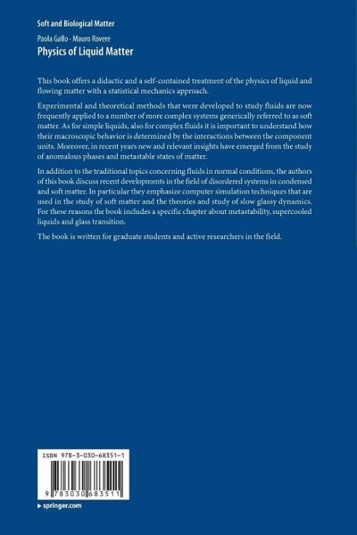 This book offers a didactic and a self-contained treatment of the physics of liquid and flowing matter with a statistical mechanics approach. Experimental and theoretical methods that were developed to study fluids are now frequently applied to a number of more complex systems generically referred to as soft matter. As for simple liquids, also for complex fluids it is important to understand how their macroscopic behavior is determined by the interactions between the component units. Moreover, in recent years new and relevant insights have emerged from the study of anomalous phases and metastable states of matter. In addition to the traditional topics concerning fluids in normal conditions, the authors of this book discuss recent developments in the field of disordered systems in condensed and soft matter. In particular they emphasize computer simulation techniques that are used in the study of soft matter and the theoriesand study of slow glassy dynamics. For these reasons the book includes a specific chapter about metastability, supercooled liquids and glass transition. The book is written for graduate students and active researchers in the field.