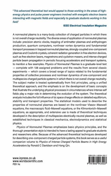 A nonneutral plasma is a many-body collection of charged particles in which there is not overall charge neutrality. The diverse areas of application of nonneutral plasmas include: precision atomic clocks, trapping of antimatter plasmas and antihydrogen production, quantum computers, nonlinear vortex dynamics and fundamental transport processes in trapped nonneutral plasmas, strongly-coupled one-component plasmas and Coulomb crystals, coherent radiation generation in free electron devices, such as free electron lasers, magnetrons and cyclotron masers, and intense charged particle beam propagation in periodic focusing accelerators and transport systems, to mention a few examples. Physics of Nonneutral Plasmas is a graduate-level text - complete with 138 assigned problems and the results from several classic experiments - which covers a broad range of topics related to the fundamental properties of collective processes and nonlinear dynamics of one-component and multispecies charged particle systems in which there is not overall charge neutrality. The subject matter is treated systematically from first principles, using a unified theoretical approach, and the emphasis is on the development of basic concepts that illustrate the underlying physical processes in circumstances where intense self fields play a major role in determining the evolution of the system. The theoretical analysis includes the full influence of dc space charge effects on detailed equilibrium, stability and transport properties. The statistical models used to describe the properties of nonneutral plasmas are based on the nonlinear Vlasov-Maxwell equations, the macroscopic fluid-Maxwell equations, or the Klimontovich-Maxwell equations, as appropriate, and extensive use is made of theoretical techniques developed in the description of multispecies electrically-neutral plasmas, as well as established techniques in classical mechanics, electrodynamics and statistical physics. Physics of Nonneutral Plasmas emphasizes basic physics principles, and the thorough presentation style is intended to have a lasting appeal to graduate students and researchers alike. Because of the advanced theoretical techniques developed for describing one-component charged particle systems, this book serves as a useful companion volume to Physics of Intense Charged Particle Beams in High Energy Accelerators by Ronald C Davidson and Hong Qin.