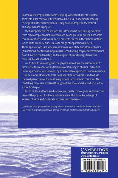 List of Portraits; Preface; Part I. Different Classes of Solitons: Introduction; 1. Nontopological solitons: the Korteweg-de Vries equation; 2. Topological soltitons: sine-Gordon equation; 3. Envelope solitons and nonlinear localisation: the nonlinear Schrödinger equation; 4. The modelling process: ion acoustic waves in a plasma; Part II. Mathematical Methods for the Study of Solitons: Introduction; 5. Linearisation around the soliton solution; 6. Collective coordinate method; 7. The inverse-scattering transform; Part III. Examples in Solid State and Atomic Physics: Introduction; 8. The Ferm-Pasta-Ulam problem; 9. A simple model for dislocations in crystals; 10. Ferroelectric domain walls; 11. Incommensurate phases; 12. Solitons in magnetic systems; 13. Solitons in Conducting polymers; 14. Solitons in Bose-Einstein condensates; Part IV. Nonlinear Excitations in Biological Molecules: Introduction; 15. Energy localisation and transfer in proteins; 16. Nonlinear dynamics and statistical physics of DNA; Conclusion: Physical solitons: do they exist?; Part V. Appendices: A. Derivation of the KdV equation for surface hydrodynamic waves; B. Mechanics of a continuous medium; C. Coherent states of an harmonic oscillator; References; Index.