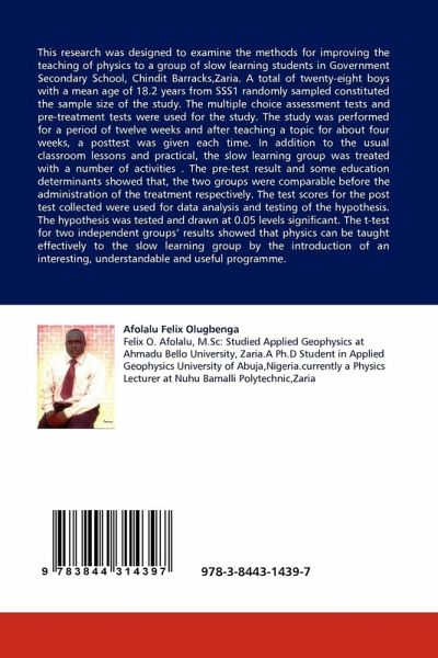 This research was designed to examine the methods for improving the teaching of physics to a group of slow learning students in Government Secondary School, Chindit Barracks,Zaria. A total of twenty-eight boys with a mean age of 18.2 years from SSS1 randomly sampled constituted the sample size of the study. The multiple choice assessment tests and pre-treatment tests were used for the study. The study was performed for a period of twelve weeks and after teaching a topic for about four weeks, a posttest was given each time. In addition to the usual classroom lessons and practical, the slow learning group was treated with a number of activities . The pre-test result and some education determinants showed that, the two groups were comparable before the administration of the treatment respectively. The test scores for the post test collected were used for data analysis and testing of the hypothesis. The hypothesis was tested and drawn at 0.05 levels significant. The t-test for two independent groups' results showed that physics can be taught effectively to the slow learning group by the introduction of an interesting, understandable and useful programme.
