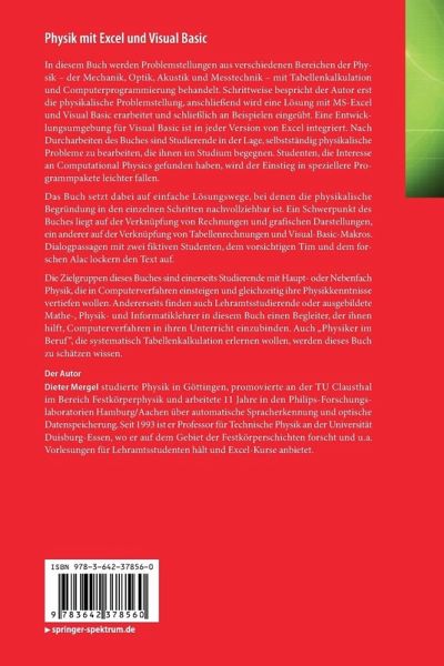 Die Zielgruppen dieses Buches sind einerseits Studierende mit Haupt- oder Nebenfach Physik, die in Computerverfahren einsteigen und gleichzeitig ihre Physikkenntnisse vertiefen wollen. Andererseits finden auch Lehramtsstudierende oder ausgebildete Mathe-, Physik- und Informatiklehrer in diesem Buch einen Begleiter, der ihnen hilft, Computerverfahren in ihren Unterricht einzubinden. Auch "Physiker im Beruf", die systematisch Tabellenkalkulation erlernen wollen, werden dieses Buch zu schätzen wissen.