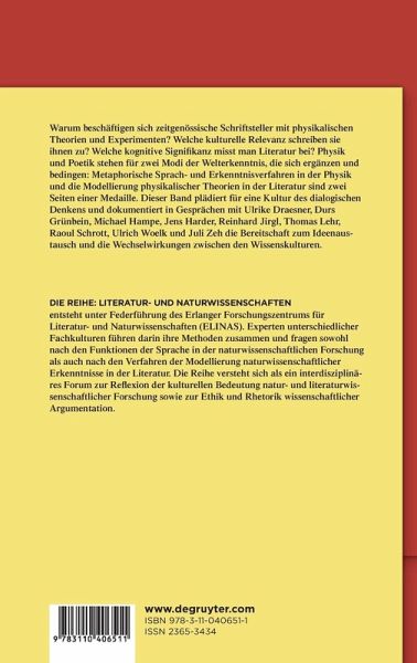 Physics and literature are two forms of knowing the world that are both complementary and contingent. Poetical-physical ways of writing and metaphors in physical theories are two sides of a coin. Interviews with Ulrike Draesner, Durs Grünbein, Michael Hampe, Jens Harder, Reinhard Jirgl, Thomas Lehr, Ulrich Woelk, and Juli Zeh enrich our knowledge of these two cultures through voices familiar with both sides.