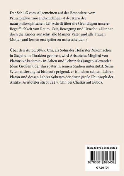 Der Schluß vom Allgemeinen auf das Besondere, vom Prinzipiellen zum Indiviudellen ist der Kern der naturphilosophischen Lehrschrift über die Grundlagen unserer Begrifflichkeit von Raum, Zeit, Bewegung und Ursache. "Nennen doch die Kinder zunächst alle Männer Vater und alle Frauen Mutter und lernen erst später zu unterscheiden."