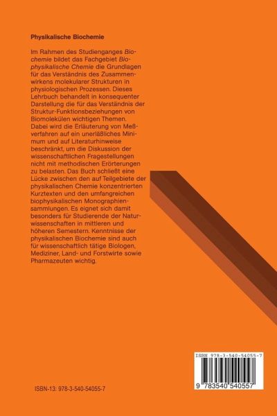 Im Rahmen des Studienganges Biochemie bildet das Fachgebiet Biophysikalische Chemie die Grundlage für das Verständnis des Zusammenwirkens molekularer Strukturen in physiologischen Prozessen. Dieses Lehrbuch behandelt in konsequenter Darstellung die für das Verständnis der Struktur-Funktionsbeziehungen von Biomolekülen wichtigen Themen. Dabei wird die Erläuterung von Meßverfahren auf ein unerläßliches Minimum und auf Literaturhinweise beschränkt, um die Diskussion der wissenschaftlichen Fragestellungen nicht mit methodischen Erörterungen zu belasten. Das Buch schließt eine Lücke zwischen den auf Teilgebiete der physikalischen Chemie konzentrierten Kurztexten und den umfangreichen biophysikalischen Monographiensammlungen. Es eignet sich damit besonders für Studierende der Naturwissenschaften in mittleren und höheren Semestern. Kenntnisse der physikalischen Biochemie sind auch für wissenschaftlich tätige Biologen, Mediziner, Land- und Forstwirte sowie Pharmazeuten wichtig.
