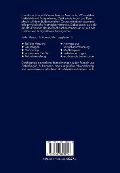 0. Durchführung und Auswertung von Experimenten.- 0.1. Das Versuchsprotokoll.- 0.2. Meßfehler.- 0. 3. Vorexperiment zu Meßfehlern.- I. Mechanik.- V1: Eindimensionale Bewegungen.- V2: Stoß-Prozesse.- V3: Trägheitsmomente.- V4: Gravitationskonstante.- V5: Kreisel.- V6: Viskosität.- V7: Schwingungen.- V8: Überlagerung und Kopplung von Schwingungen.- V9: Schallgeschwindigkeit.- II. Wärme.- V10: Spezifische Wärmekapazität.- V11: Schmelz- und Kondensationswärme.- V12: Adiabaten-Exponent.- V13: Stirling-Prozeß.- III. Elektrizität und Magnetismus.- V14: Gleichstromkreise.- VI 5: Wechselstromkreise.- VI 6: Elektrische Schwingungen.- VI7: Brückenschaltung.- VI8: Transformator.- VI9: Dioden-Kennlinien.- V20: Transistoren.- V21: Digitale Grundschaltungen.- V22: Magnetisches Feld.- IV. Optik.- V23: Linsen und Linsensysteme.- V24: Polarisation von Licht.- V25: Interferometer.- V26: Beugung am Einfach- und Mehrfachspalt.- V27: Gitter-Spektralapparat und Monochromator.- V. Atom- und Kernphysik.- V28: Spezifische Elektronenladung.- V29: Das Millikan-Experiment.- V30: Der Fotoeffekt.- V31: Beugung von Materiewellen.- V32: Franck-Hertz-Versuch.- V33: Ionisierende Strahlung.- V34: Zählstatistik.- V35: Röntgenspektren.- V36: Radioaktiver Zerfall.