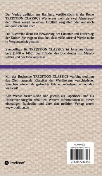 Diese Hardcover-Ausgabe ist Teil der TREDITION CLASSICS. Der Verlag tredition aus Hamburg veröffentlicht in der Buchreihe TREDITION CLASSICS Werke aus mehr als zwei Jahrtausenden. Diese waren zu einem Großteil vergriffen oder nur noch antiquarisch erhältlich. Mit TREDITION CLASSICS verfolgt tredition das Ziel, tausende Klassiker der Weltliteratur verschiedener Sprachen wieder als gedruckte Bücher zu verlegen und das weltweit! Die Buchreihe dient zur Bewahrung der Literatur und Förderung der Kultur. Sie trägt so dazu bei, dass viele tausend Werke nicht in Vergessenheit geraten.