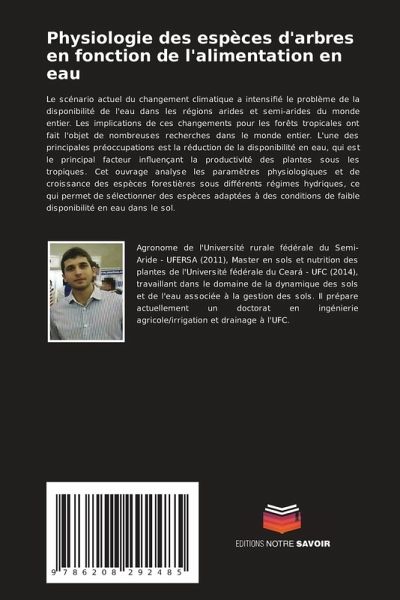 Le scénario actuel du changement climatique a intensifié le problème de la disponibilité de l'eau dans les régions arides et semi-arides du monde entier. Les implications de ces changements pour les forêts tropicales ont fait l'objet de nombreuses recherches dans le monde entier. L'une des principales préoccupations est la réduction de la disponibilité en eau, qui est le principal facteur influençant la productivité des plantes sous les tropiques. Cet ouvrage analyse les paramètres physiologiques et de croissance des espèces forestières sous différents régimes hydriques, ce qui permet de sélectionner des espèces adaptées à des conditions de faible disponibilité en eau dans le sol.