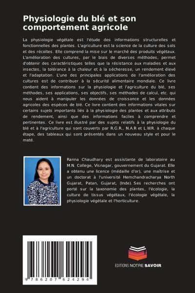 La physiologie végétale est l'étude des informations structurelles et fonctionnelles des plantes. L'agriculture est la science de la culture des sols et des récoltes. Elle comprend la mise sur le marché des produits végétaux. L'amélioration des cultures, par le biais de diverses méthodes, permet d'obtenir des caractéristiques telles que la résistance aux maladies et aux insectes, la tolérance à la chaleur et à la sécheresse, un rendement élevé et l'adaptation. L'une des principales applications de l'amélioration des cultures est de contribuer à la sécurité alimentaire mondiale. Ce livre contient des informations sur la physiologie et l'agriculture du blé, ses méthodes, ses applications, ses objectifs, ses méthodes de calcul, etc. qui nous aident à manipuler les données de croissance et les données agricoles des espèces de blé. Ce livre contient des informations vitales sur certains sujets importants liés à la physiologie des plantes et aux attributs de rendement, ainsi que des informations faciles à comprendre et pertinentes. Ce livre est illustré par des sujets relatifs à la physiologie du blé et à l'agriculture qui sont couverts par R.G.R., N.A.R et L.W.R. à chaque étape, des tableaux qui sont présentés dans un nouveau style et pour le maté.