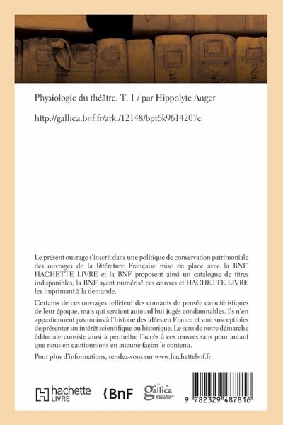 Physiologie du théâtre. T. 1 / par Hippolyte Auger Date de l'édition originale: 1839-1840 Le présent ouvrage s'inscrit dans une politique de conservation patrimoniale des ouvrages de la littérature Française mise en place avec la BNF. HACHETTE LIVRE et la BNF proposent ainsi un catalogue de titres indisponibles, la BNF ayant numérisé ces oeuvres et HACHETTE LIVRE les imprimant à la demande. Certains de ces ouvrages reflètent des courants de pensée caractéristiques de leur époque, mais qui seraient aujourd'hui jugés condamnables. Ils n'en appartiennent pas moins à l'histoire des idées en France et sont susceptibles de présenter un intérêt scientifique ou historique. Le sens de notre démarche éditoriale consiste ainsi à permettre l'accès à ces oeuvres sans pour autant que nous en cautionnions en aucune façon le contenu. Pour plus d'informations, rendez-vous sur www.hachettebnf.fr