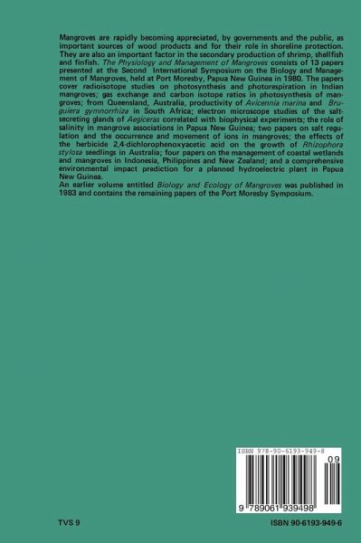 1. Photosynthesis and photorespiration in mangroves.- 2. Photosynthetic gas exchange properties and carbon isotope ratios of some mangroves in North Queensland.- 3. Productivity and phenology of Avicennia marina (Forsk.) Vierh. and Bruguiera gymnorrhiza (L.) Lam. in Mgeni estuary, South Africa.- 4. Structural features of the salt gland of Aegiceras.- 5. Ions in mangroves.- 6. Movement of ions and water into the xylem sap of tropical mangroves.- 7. Observations on water salinity in mangrove associations at two localities in Papua New Guinea.- 8. The effects of 2,4-D on the growth of Rhizophora stylosa Griff. Seedlings.- 9. A realistic approach to the use and management of mangrove areas in Southeast Asia.- 10. The mangrove ecosystem in Indonesia, its problems and management.- 11. Mangrove management in the Philippines.- 12. Possible impacts of the planned hydroelectric scheme on the Purari River deltaic and coastal sea ecosystems (Papua New Guinea).- 13. Overcoming problems in the management of New Zealand mangrove forests.