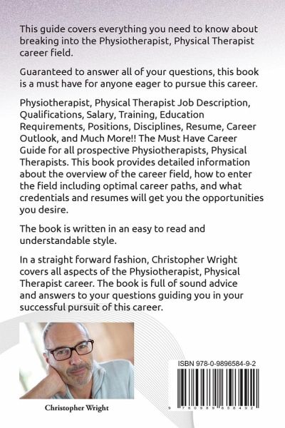 This guide covers everything you need to know about breaking into the Physiotherapist, Physical Therapist career field. Guaranteed to answer all of your questions, this book is a must have for anyone eager to pursue this career. Physiotherapist, Physical Therapist Job Description, Qualifications, Salary, Training, Education Requirements, Positions, Disciplines, Resume, Career Outlook, and Much More!! The Must Have Guide for all prospective Physiotherapists, Physical Therapists. This book provides detailed information about the overview of the career field, how to enter the field and career paths, and what credentials and resumes will get you opportunities. The book is written in an easy to read and understandable style. In a straight forward fashion, Christopher Wright covers all aspects of the Physiotherapist, Physical Therapist career. The book is full of sound advice and answers to your questions guiding you in your successful pursuit of this career.