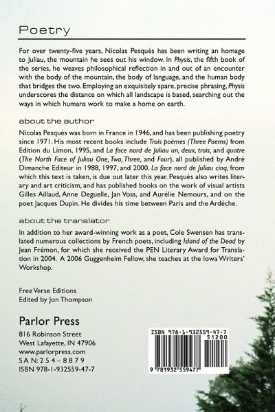 For over twenty-five years, NICOLAS PESQUÈS has been writing an homage to Juliau, the mountain he sees out his window. In PHYSIS, the fifth book of the series, he weaves philosophical reflection in and out of an encounter with the body of the mountain, the body of language, and the human body that bridges the two. Employing an exquisitely spare, precise phrasing, PHYSIS underscores the distance on which all landscape is based, searching out the ways in which humans work to make a home on earth. ABOUT THE AUTHOR NICOLAS PESQUÈS was born in France in 1946, and has been publishing poetry since 1971. His most recent books include Trois poèmes (Three Poems) from Edition du Limon, 1995, and La face nord de Juliau un, deux, trois, and quatre (The North Face of Juliau One, Two, Three, and Four), all published by André Dimanche Editeur in 1988, 1997, and 2000. La face nord de Juliau cinq, from which this text is taken, is due out later this year. Pesquès also writes literary and art criticism, and has published books on the work of visual artists Gilles Aillaud, Anne Deguelle, Jan Voss, and Aurélie Nemours, and on the poet Jacques Dupin. He divides his time between Paris and the Ardèche. ABOUT THE TRANSLATOR In addition to her award-winning work as a poet, COLE SWENSEN has translated numerous collections by French poets, including ISLAND OF THE DEAD by Jean Frémon, for which she received the PEN LITERARY AWARD FOR TRANSLATION in 2004. A 2006 Guggenheim Fellow, she teaches at the Iowa Writers' Workshop.