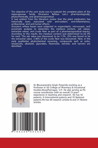 The objective of the cent study was to evaluate the complete plant of the Asparagaceae family (Dracaena Reflexa Lam.) pharmacologically, phytochemically, and pharmacognostical. It was evident from the literature review that the plant medication has historically been associated with anti-oxidant, anti-inflammatory, antibacterial, and anti-tumor effects. Dracaena reflexa leaves were subjected to organoleptic, microscopic, and proximate analyses to determine the moisture content, ash values, extractive values, and crude fiber as part of a pharmacognostical inquiry. According to the results, the moisture content was determined to be 6% for each. The ash value was discovered to be 7.5%. 25% was found to be the extractive value. 2.46% of the crude fiber was discovered. Next, in the early qualitative phytochemical screening, compounds such as carbs, terpenoids, alkaloids, glycosides, flavonoids, steroids, and tannins are identified.