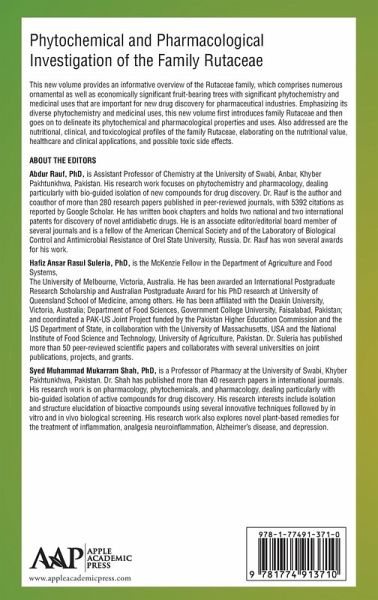 Abdur Rauf, PhD, is Assistant Professor, Department of Chemistry, University of Swabi, Anbar, Khyber Pakhtunkhwa, Pakistan. His research work focuses on phytochemistry and pharmacology, dealing particularly with bio-guided isolation of new compounds for drug discovery. His research interests include isolation and structure elucidation of bioactive compounds using several innovative techniques followed by in vitro and in vivo biological screening. Dr. Rauf is the author and coauthor of more than 280 research papers published in peer-reviewed journals, with 5392 citations as reported by Google Scholar. He has also written 10 book chapters in international books and holds two national and two international patents for discovery of novel antidiabetic drugs. Furthermore, e is an associate editor/editorial board member of Frontier in Pharmacology, Biocell, Green Processing and Synthesis, and Medicinal Chemistry, among others. He is also a fellow of the American Chemical Society and of the Laboratory of Biological Control and Antimicrobial Resistance of Orel State University, Russia. He has supervised two PhD and four MPhil students. Dr. Rauf has won a Young Scientist Award from the Directorate of Science and Technology, KP, Pakistan (2018), and the Research Productivity Award (2016-17) from the Pakistan Science Foundation. He has also won eight national and four international projects. The major goals of Dr. Rauf's research include the discovery of eco-friendly and cost-effective protocols for the production of nanoparticles-based new drugs with bio-medicinal interest. He completed his PhD at the Institute of Chemical Sciences, University of Peshawar, Pakistan, in 2015. Hafiz Ansar Rasul Suleria, PhD, is in the School of Agriculture and Food, Faculty of Veterinary and Agricultural Sciences, The University of Melbourne, Parkville, Victoria, Australia. He was formerly the Alfred Deakin Research Fellow at Deakin University, Victoria, Australia. He did his postdoctoral fellowship at the Department of Food, Nutrition, Dietetic and Health at Kansas State University, USA. He is also an Honorary Fellow of the Diamantina Institute, Faculty of Medicine, The University of Queensland (UQ), Australia. Dr. Suleria has been awarded an International Postgraduate Research Scholarship and the Australian Postgraduate Award for his PhD research at the UQ School of Medicine and the Translational Research Institute in collaboration with the Commonwealth and Scientific and Industrial Research Organization, Australia. Before joining the UQ, he worked as a lecturer in the Department of Food Sciences, Government College University Faisalabad, Pakistan. He also worked as a research associate in the PAK-US Joint Project funded by the Higher Education Commission, Pakistan, and Department of State, USA, with collaboration of the University of Massachusetts, USA, and the National Institute of Food Science and Technology, University of Agriculture Faisalabad, Pakistan. Dr. Suleria has published more than 80 peer-reviewed scientific papers in professional journals and has co-edited several books. He is also in collaboration with more than ten universities where he is working as a co-supervisor/special member for PhD and postgraduate students. His major research focus is on food nutrition, particularly in screening of bioactive molecules, including isolation, purification, and characterization using various cutting-edge techniques from different plants, marine, and animal sources; in vitro, in vivo bioactivities; and cell culture and animal modeling. Syed Muhammad Mukarram Shah, PhD, is currently working as Professor in the Department of Pharmacy, University of Swabi, Khyber Pakhtunkhwa, Pakistan. Dr. Shah has published more than 40 research papers in international journals. His research work is on pharmacology, phytochemicals, and pharmacology, dealing particularly with bio-guided isolation of active compounds for drug discovery. His research interests include isolation and structure elucidation of bioactive compounds using several innovative techniques followed by in vitro and in vivo biological screening. His research work also explores novel plant-based remedies for the treatment of inflammation, analgesia neuroinflammation, Alzheimer's disease, and depression.