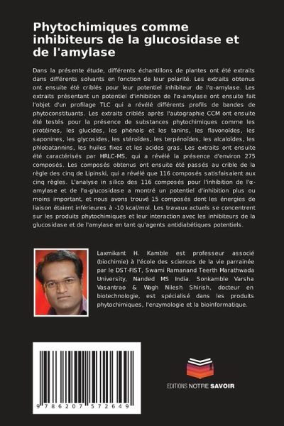 Dans la présente étude, différents échantillons de plantes ont été extraits dans différents solvants en fonction de leur polarité. Les extraits obtenus ont ensuite été criblés pour leur potentiel inhibiteur de l' -amylase. Les extraits présentant un potentiel d'inhibition de l' -amylase ont ensuite fait l'objet d'un profilage TLC qui a révélé différents profils de bandes de phytoconstituants. Les extraits criblés après l'autographie CCM ont ensuite été testés pour la présence de substances phytochimiques comme les protéines, les glucides, les phénols et les tanins, les flavonoïdes, les saponines, les glycosides, les stéroïdes, les terpénoïdes, les alcaloïdes, les phlobatannins, les huiles fixes et les acides gras. Les extraits ont ensuite été caractérisés par HRLC-MS, qui a révélé la présence d'environ 275 composés. Les composés obtenus ont ensuite été passés au crible de la règle des cinq de Lipinski, qui a révélé que 116 composés satisfaisaient aux cinq règles. L'analyse in silico des 116 composés pour l'inhibition de l' -amylase et de l' -glucosidase a montré un potentiel d'inhibition plus ou moins important, et nous avons trouvé 15 composés dont les énergies de liaison étaient inférieures à -10 kcal/mol. Les travaux actuels se concentrent sur les produits phytochimiques et leur interaction avec les inhibiteurs de la glucosidase et de l'amylase en tant qu'agents antidiabétiques potentiels.