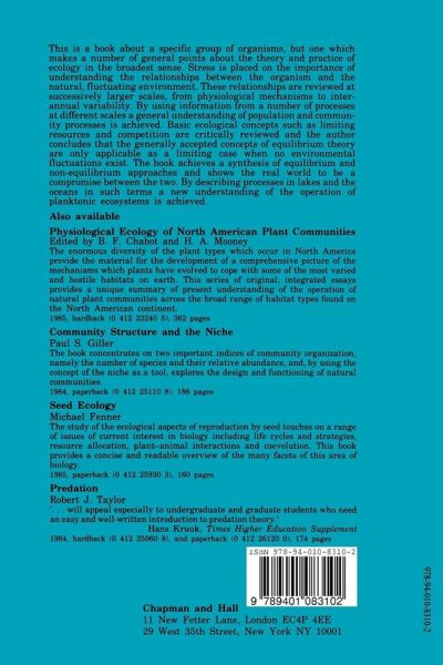 1 Preamble.- 1.1 A brief introduction to the organisms.- 2 Ecological theory.- 2.1 An historical perspective: the concept of plenitude.- 2.2 Ecology and evolution.- 2.3 Equilibrium theory.- 2.4 The equilibrium theory of community structure.- 2.5 Criticisms of equilibrium theory.- 2.6 Non-equilibrium theory.- 2.7 Some ideas from non-equilibrium thermodynamics.- 3 Some basic physics.- 3.1 Scales of turbulent kinetic energy generation.- 3.2 The physics of surface waters.- 4 The chemical environment.- 4.1 The Redfield ratio.- 4.2 The major ions.- 4.3 The major nutrients.- 5 Defining the scales of interest.- 5.1 Patchiness in space and time.- 5.2 The biological response to variability in space and time.- 5.3 Models of competition between phytoplankton.- 6 The measurement of productivity and growth rates.- 6.1 The interpretation of kinetic measurements.- 6.2 The integration of metabolic pathways.- 6.3 Time scales and the effects of bottle containment.- 6.4 From kinetics to growth rates?.- 7 The concept of limiting nutrients.- 7.1 Rate processes in oligotrophic waters.- 7.2 The cycling of N and P in lakes and the oceans.- 7.3 Nutrient cycling, elemental ratios and the 'Redfield ratio'.- 7.4 Patterns in temporal fluctuations.- 7.5 Whole basin averages.- 8 Physiological scales: non-steady state conditions in the field.- 8.1 The effects of environmental variability on growth rates.- 8.2 Energy, nutrients and cell size: a synthesis.- 9 Seasonal patterns of distribution and abundance.- 9.1 Spatial distribution of biomass.- 9.2 The seasonal cycle of phytoplankton growth.- 9.3 Manipulation of the seasonal cycle of biomass.- 9.4 The influence of mixed layer physics on biomass distributions.- 9.5 Ecological succession.- 9.6 The seasonal succession and community structure ofphytoplankton.- 9.7 Sampling and counting problems: time and space scales.- 9.8 The seasonal successions of species: the ideal sequences.- 9.9 Nutrient ratios and the role of competition.- 10 Community structure and function in turbulent environments.- 10.1 Processes in phytoplankton successions.- 10.2 Structural trends in succession.- 10.3 Rates of succession.- 10.4 Succession in turbulent mixed layers.- 10.5 Manipulation of the species composition.- 10.6 Biomanipulation.- 11 Large number systems: empiricism.- 11.1 Observations of ecological diversity.- 11.2 Predictions of the distribution and occurrence of species.- 11.3 Phosphorus loadings and algal biomass.- 11.4 Manipulation of algal biomass.- 11.5 Phosphorus loadings and hypolimnial anoxia.- 11.6 Phosphorus loadings and the biomass of other organisms in the food chain.- 11.7 Size distributions in food chains.- 11.8 Phytoplankton biomass and fish production.- 12 Interannual variability.- 12.1 Long-term changes in phytoplankton abundance.- References.
