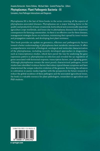 Chapter 1. Genome sequencing.- Chapter 2. Phytoplasma effectors and pathogenicity factors.- Chapter 3. Transcriptomic and proteomic studies of phytoplasma-infected plants.- Chapter 4. Plant-insect host switching mechanism.- Chapter 5. Diversity and functional importance of phytoplasma membrane proteins.- Chapter 6. Phytoplasma cultivation.- Chapter 7. Molecular and serological approaches in detection of phytoplasmas in plants and insects.- Chapter 8. The development and deployment of rapid in-field phytoplasma diagnostics exploiting isothermal amplification DNA-detection systems.- Chapter 9. Multilocus genetic characterization of phytoplasmas.- Chapter 10. Host metabolic interaction and perspectives in phytoplasma research.