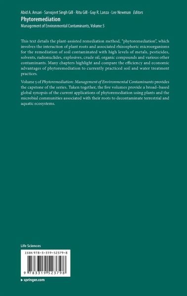 1 Microbial Inoculants Assisted Phytoremediation for Sustainable Soil Management.- 2 Phytoremediation of Salt-Impacted Soils and Use of Plant Growth Promoting Rhizobacteria (PGPR) to Enhance Phytoremediation.- 3 Successful Integrated Bioremediation System of Hydrocarbon-Contaminated Soil at a Former Oil Refinery Using Autochthonous Bacteria and Rhizo-Microbiota.- 4 Phytoremediation of Petroleum Contaminated Soil in Association with Soil Bacteria.- 5 The Use of Higher Plants in Biomonitoring and Environmental Bioremediation. Possibilities of Woody Plants Use in Biomonitoring and Bioremediation.- 6 Phytoremediation Applications for Metal Contaminated Soils Using Terrestrial Plants in Vietnam.- 7 Essential Elements and Toxic Metals in Some Crops, Medicinal Plants and Trees.- 8 Phytoremidiaion Using Aquatic Macrophytes.- 9 Remediation of Pharmaceutical and Personal Care Products (PPCPs) in Constructed Wetlands-Applicability and New Perspectives.- 10 Floating Wetlands for the Improvement of Water Quality and Provision of Ecosystem Services in Urban Eutrophic Lakes.- 11 Green Aquaculture: Designing and Developing Aquaculture Systems Integrated with Phytoremediation Treatment Options.- 12 Modeling the Phytoremediation: Concepts, Models and Approaches.- 13 Genetic Control of Metal Sequestration in Hyperaccumulator Plants.- 14 Engineered Nanomaterials for Phytoremediation of Metal/Metalloids Contaminated Soils: Implications for Plant Physiology.- 15 Phytoremediation Application: Plants as Biosorbent for Metal Removal in Soil and Water.- 16 Nutrient Management Strategies for Coping with Climate Change in Irrigated Smallholder Cropping Systems in Southern Africa.- 17 Phytoremediation of Landfill Leachates.- 18 Phytomining of Rare and Valuable Metals.- 19 Air Phytoremediation.