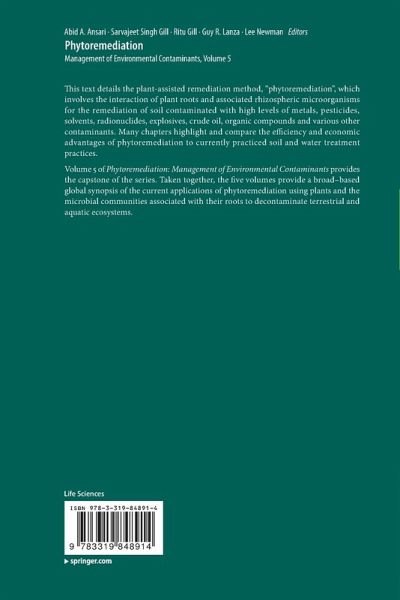 1 Microbial Inoculants Assisted Phytoremediation for Sustainable Soil Management.- 2 Phytoremediation of Salt-Impacted Soils and Use of Plant Growth Promoting Rhizobacteria (PGPR) to Enhance Phytoremediation.- 3 Successful Integrated Bioremediation System of Hydrocarbon-Contaminated Soil at a Former Oil Refinery Using Autochthonous Bacteria and Rhizo-Microbiota.- 4 Phytoremediation of Petroleum Contaminated Soil in Association with Soil Bacteria.- 5 The Use of Higher Plants in Biomonitoring and Environmental Bioremediation. Possibilities of Woody Plants Use in Biomonitoring and Bioremediation.- 6 Phytoremediation Applications for Metal Contaminated Soils Using Terrestrial Plants in Vietnam.- 7 Essential Elements and Toxic Metals in Some Crops, Medicinal Plants and Trees.- 8 Phytoremidiaion Using Aquatic Macrophytes.- 9 Remediation of Pharmaceutical and Personal Care Products (PPCPs) in Constructed Wetlands-Applicability and New Perspectives.- 10 Floating Wetlands for the Improvement of Water Quality and Provision of Ecosystem Services in Urban Eutrophic Lakes.- 11 Green Aquaculture: Designing and Developing Aquaculture Systems Integrated with Phytoremediation Treatment Options.- 12 Modeling the Phytoremediation: Concepts, Models and Approaches.- 13 Genetic Control of Metal Sequestration in Hyperaccumulator Plants.- 14 Engineered Nanomaterials for Phytoremediation of Metal/Metalloids Contaminated Soils: Implications for Plant Physiology.- 15 Phytoremediation Application: Plants as Biosorbent for Metal Removal in Soil and Water.- 16 Nutrient Management Strategies for Coping with Climate Change in Irrigated Smallholder Cropping Systems in Southern Africa.- 17 Phytoremediation of Landfill Leachates.- 18 Phytomining of Rare and Valuable Metals.- 19 Air Phytoremediation.
