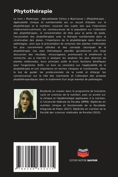 Le livre « Fitoterapia : Aplicabilidade Clínica e Nutricional » (Phytothérapie : Applicabilité clinique et nutritionnelle) est un recueil d'études sur la phytothérapie et la nutrition, couvrant des sujets tels que l'interaction médicament-nutriment, les connaissances de la population sur l'utilisation des phytothérapies, la consommation de thés pour la perte de poids, l'association des phytothérapies avec la thérapie nutritionnelle dans la cicatrisation des plaies, l'importance de la phytothérapie dans diverses pathologies, ainsi que la présentation de certaines des plantes médicinales les plus couramment utilisées et des concepts classiques de la phytothérapie. Les axes thématiques abordés garantissent une large discussion des résultats, encourageant, promouvant et améliorant la recherche, qui a cherché à analyser les espèces les plus diverses de plantes médicinales, leurs principes actifs et leurs fonctions bénéfiques pour l'organisme. Enfin, ce livre se concentre sur l'applicabilité de la phytothérapie et son importance en termes cliniques et nutritionnels, dans le but de guider les professionnels de la santé et d'élargir les connaissances sur le rôle des nutriments et l'utilisation des produits phytothérapeutiques dans le traitement d'un large éventail de pathologies.