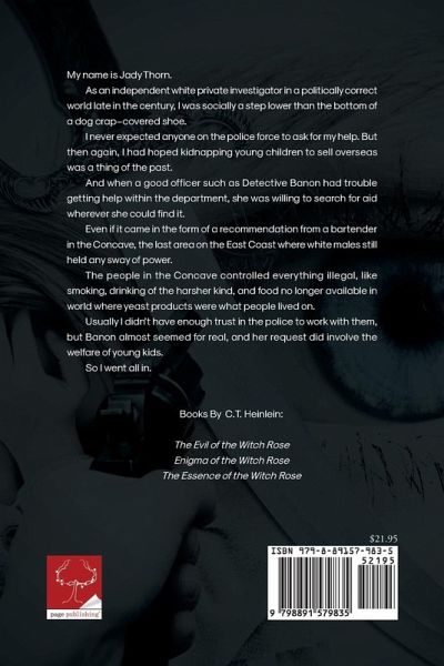 My name is Jady Thorn. As an independent white private investigator in a politically correct world late in the century, I was socially a step lower than the bottom of a dog crap-covered shoe. I never expected anyone on the police force to ask for my help. But then again, I had hoped kidnapping young children to sell overseas was a thing of the past. And when a good officer such as Detective Banon had trouble getting help within the department, she was willing to search for aid wherever she could find it. Even if it came in the form of a recommendation from a bartender in the Concave, the last area on the East Coast where white males still held any sway of power. The people in the Concave controlled everything illegal, like smoking, drinking of the harsher kind, and food no longer available in world where yeast products were what people lived on. Usually I didn't have enough trust in the police to work with them, but Banon almost seemed for real, and her request did involve the welfare of young kids. So I went all in.