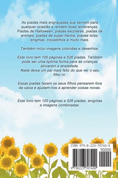As piadas mais engraçadas que servem para qualquer ocasião e rendem boas lembranças. Piadas de Halloween, piadas escolares, piadas de animais, piadas de super-heróis, piadas tolas, enigmas, trocadilhos e muito mais. Também inclui imagens coloridas e desenhos. Também pode ser uma ótima forma para as crianças aliviarem a ansiedade. Nada deixa um pai mais feliz do que ver o seu filho rir. Essas piadas fazem os seus filhos pensarem fora da caixa e ajudam-nos a aprender coisas novas. Este livro tem 110 páginas e 526 piadas, enigmas e imagens combinadas.