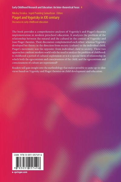 The book provides a comprehensive analyses of Vygotsky's and Piaget's theories implementation in modern preschool education. It analyzes the problem of the relationship between the natural and the cultural in the context of Vygotsky and Jean Piaget theories. Their discourses complemented each other: whereas Vygotsky developed his theory in the direction from society (culture) to the individual child, Piaget's movement was the opposite: from individual child to society. These two approaches confront modern world with the need to analyze the problem of childhood: is childhood a period of cultural exploration or is it a special form of relationship in which both the egocentrism and consciousness of the child, and the egocentrism and consciousness of culture are represented?