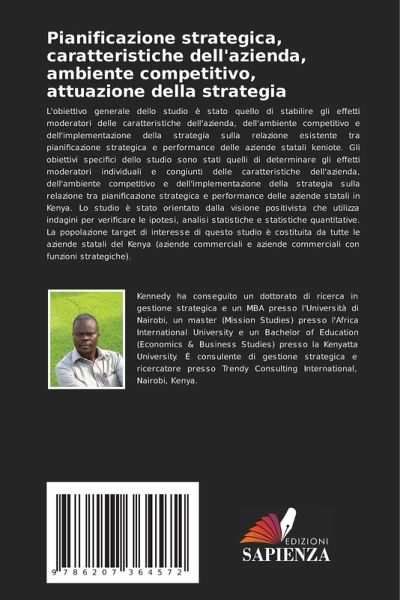 L'obiettivo generale dello studio è stato quello di stabilire gli effetti moderatori delle caratteristiche dell'azienda, dell'ambiente competitivo e dell'implementazione della strategia sulla relazione esistente tra pianificazione strategica e performance delle aziende statali keniote. Gli obiettivi specifici dello studio sono stati quelli di determinare gli effetti moderatori individuali e congiunti delle caratteristiche dell'azienda, dell'ambiente competitivo e dell'implementazione della strategia sulla relazione tra pianificazione strategica e performance delle aziende statali in Kenya. Lo studio è stato orientato dalla visione positivista che utilizza indagini per verificare le ipotesi, analisi statistiche e statistiche quantitative. La popolazione target di interesse di questo studio è costituita da tutte le aziende statali del Kenya (aziende commerciali e aziende commerciali con funzioni strategiche).