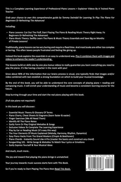 This is a Complete Learning Experience of Professional Piano Lessons + Explainer Videos By A Trained Piano Teacher Grab your chance to own this comprehensive guide by Tommy Swindali for Learning To Play The Piano For Beginners Or Refreshing The Advanced Including:Piano Lessons: Cut Out The Fluff, Start Playing The Piano & Reading Music Theory Right Away. For Beginners Or Refreshing The Advanced. Piano Music Theory: Swiftly Learn The Piano & Music Theory Essentials and Save Big on Months of Private Lessons! Traditionally, piano lessons can be very boring and require a fixed time. And most books are either too complex or boring. This often leaves people frustrated and feeling like giving up. Instead this book explains the essentials in an easy to understand way. Plus it combines them with images and videos to enhance the reader's understanding. The lessons build on skills one by one plus bonus videos to really guarantee you learn everything you need to play the piano. It's like having a teacher in the room with you! Since about 90% of the information that our brains process is visual, one typically finds that images and/or video combined with text establish a strong foundation on which to build your musical knowledge. By the end of this book, you will be able to understand the core concepts of playing piano + reading and composing music. It will enrich your understanding of music and become a consistent learning source for the future. Stop burning through your time and start the real piano playing with this book. (Full size piano not required!) In this book you will discover: Essential Music Theory & Glossary Of Terms Piano Charts, Cheat Sheets & Diagrams (learn faster & easier) Finger Exercises (We All Need Them) Identify All The Piano Notes Easily Form Or Play Original Melodies & Songs Exclusive Videos To Complete The Learning Experience Play by Ear or Reading Music (it's easy this way) The Four Elements Of Music Explained (Melody, Harmony, Rhythm, Dynamics) Easy Piano Hacks From The Grand Masters (Chopin & Beethoven) Piano Chords - Instantly Sound Like A Pro (master the basics and construct any chord) Songwriting 101 - Write Songs & Melodies To Match Your Lyrics or Emotions Easily Express Yourself & Your Musical Ideas And much, much more.. The joy and reward that playing the piano brings is unmatched. Your journey towards music success starts here with This Book. So if you're ready to Start Playing The Piano then Read This Book.