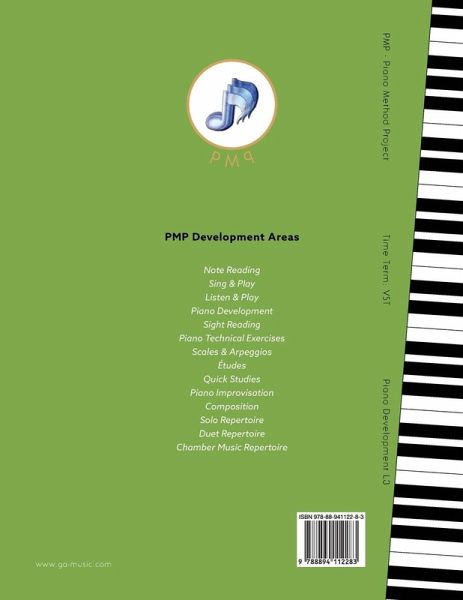 A comprehensive and effective programme must consider all of the possible sectors in which the student’s skills and competence can develop, which fall into two main categories: musicianship and instrumental skills. The Music Method Project (MusMP) comprises the Piano Method Project (PMP), related to the development of instrumental skills, and the Musicianship Method Project (MMP), related to musicianship development. Piano Development (PD) is a Development Area of PMP and is divided into a first set of 20 levels. PD consists of short pieces that the student will have to prepare in a very short time term (VST as in the MusMP conceived Time Terms), usually for the following lesson. The general complexity expressed at each level of PD does not have to be comparable to the difficulty of other areas simultaneously studied, especially if related to repertoire. Indeed, the student may find him/herself studying a repertoire piece that is much more difficult than is expressed by the level required in PD: this would be perfectly appropriate while the contrary would, surely be unfitting. The time term of PD is classified as VST while a repertoire piece may be classified from MT to VLT (Medium Term to Very Long Term); therefore, the latter can be more complex. There is no strict way in which to use this book; it can be adopted for various purposes accordingly. Nevertheless, its main purpose is to be part of the PMP. The introduction comprises directions for using this book, a description of all rhythmic patterns and time signatures found in the pieces and a description of the minimum prerequisites eventually needed for effectively starting this book. More specific direction for the teacher, related to a methodological approach to the pieces are also included; topics taken into consideration are: Accidentals Hand Positions Metronome Improvising Chamber Music Key Signatures Moving to a New Piece Moving to a New Level Monitoring