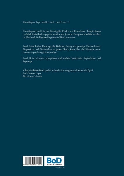 Pianofingers Pop enthält Level 1 und Level 2Pianofingers Level 1 ist der Einstieg für Kinder und Erwachsene. Tempi können natürlich individuell angepasst werden und je nach Übungsstand erhöht werden, da Rhythmik im Popbereich genau im "Beat" sein muss.Übungsstand erhöht werden. Das Metronom sollte auch eingesetzt werden, da Rhythmik im Popbereich genau im "Beat"sein muss.Level 1 sind leichte Popsongs, die Balladen, Swing und groovige Titel enthalten. Fingersätze und Demovideos zu jedem Stück kann über die Webseite www.hartmut-layer.de angeklickt werdenLevel 2 ist virtuoser komponiert und enthält Neoklassik, Popballaden und Popsongs.Allen ,die diesen Band spielen, wünsche ich von ganzem Herzen viel SpaßIhr Hartmut Layer2021 Layer´s Music