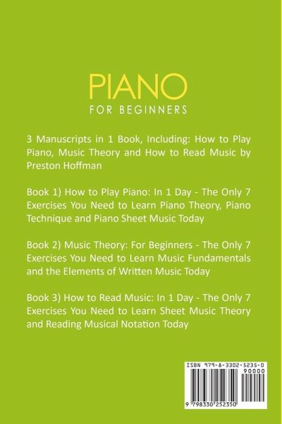 3 Manuscripts in 1 Book, Including: How to Play Piano, Music Theory and How to Read Music! Book 1) How to Play Piano: In 1 Day - The Only 7 Exercises You Need to Learn Piano Theory, Piano Technique and Piano Sheet Music Today You will learn the following: -The keyboard and keys -The pedals -Reading sheet music -Practising scales -Adding in chords -Sharps and flats -Timing -And much more! Book 2) Music Theory: For Beginners - The Only 7 Exercises You Need to Learn Music Fundamentals and the Elements of Written Music Today Do you get overwhelmed by all the complex concepts and want a book that is simple and clear? If so, "Music Theory: For Beginners" by Preston Hoffman is the book for you! It will provide you with seven key exercises that will help deepen your understanding of music theory! Book 3) How to Read Music: In 1 Day - The Only 7 Exercises You Need to Learn Sheet Music Theory and Reading Musical Notation Today You have made an excellent decision by choosing to learn the piano. So, don't delay it any longer. Take this opportunity and purchase your copy today. Order "Piano: For Beginners" Now!