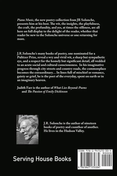 Piano Music, the new poetry collection from JR Solonche, presents him at his best. The wit, the insights, the playfulness, the craft, the profundity, and yes, at times the silliness, are all here on full display to the delight of the reader, whether that reader be new to the Solonche universe or one returning for more.