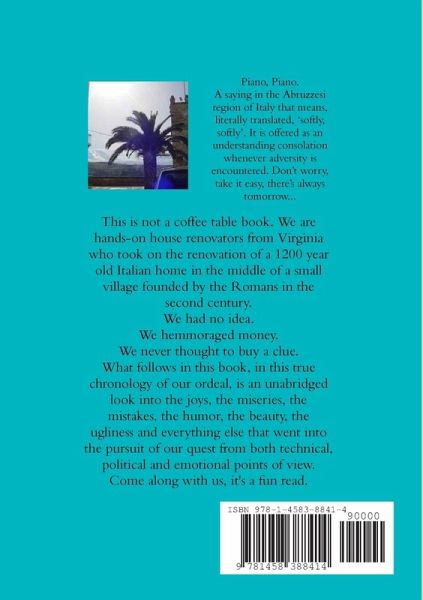 Anne and I are hands-on inner-city house renovators from Richmond, VA, who happened to make good on some real estate investments. We are not now, nor have we ever been, rich. We are front runners who go where others fear to tread. Some call us foolish, most call us courageous, everyone thinks we're crazy but we have a lot of fun. And we work hard. And we drink a lot of wine. We organized a tour of seventeen houses in Italy offered for sale via the Internet. We bought a 1200-year-old 3000 sq ft house to renovate on the main piazza of an old walled village founded by the Romans around 200 AD. It was not a Ryan Home. What follows in this book, in this true chronology of our ordeal, is an unabridged look into the joys, the miseries, the mistakes, the humor, the beauty, the ugliness and everything else that went into the pursuit of our quest from both technical, political and emotional points of view. It's a fun read, go ahead, risk $2.99 and tag along with us for a few hours of entertainment.