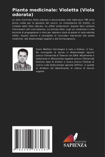 La viola mammola (Viola odorata) è documentata nella letteratura TIM come prima scelta per la gestione del cancro. La cicloviolacina O2 (CyO2), un ciclotide della Viola odorata, ha effetti antitumorali. Questo libro contiene informazioni utili sulla botanica, sui principi attivi, sugli usi medicinali e sulle tecniche di propagazione in vitro per ottenere stock di piante di viola odorata d'élite. Questo volume è consigliato ai ricercatori interessati alle piante medicinali, alle biotecnologie vegetali e alla farmacognosia.