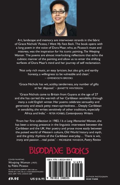 Art, landscape, and memory are interwoven strands in the fabric of Grace Nichols' latest collection, Picasso, I Want My Face Back. The book opens with a long poem in the voice of Dora Maar, who, as Picasso's muse and mistress, was the inspiration for his iconic painting, The Weeping Woman. The poems are almost interlocking reflections that echo the cubist manner of the painting and allow us to enter the shifting surfaces of Dora Maar's mind and her journey of self reclamation.