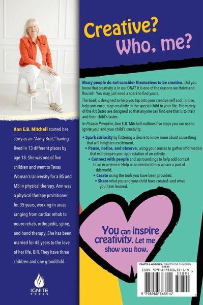 Creative? Who, me? Many people do not consider themselves to be creative. Did you know that creativity is in our DNA? It is one of the reasons we thrive and flourish. You may just need a spark to find yours. The book is designed to help you tap into your creative self and, in turn, help you encourage creativity in the special child in your life. The variety of the Art Dates are designed so that anyone can find one that is to their and their child's tastes. In Picasso Pumpkin, Ann E. B. Mitchell outlines five steps you can use to ignite your and your child's creativity:Spark curiosity by fostering a desire to know more about something that will heighten excitement. Pause, notice, and observe, using your senses to gather information that will deepen your appreciation of an activity. Connect with people and surroundings to help add context to an experience. Help us understand how we are a part of this world. Create using the tools you have been provided. Share what you and your child have created-and what you have learned. You can inspire creativity. Let me show you how.