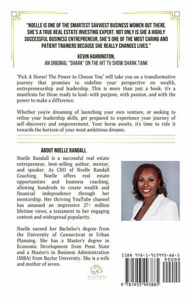 Whether you're at the crossroads of a major life decision, seeking clarity in your personal or professional life, or yearning for a deeper connection with your true self, get prepared to experience a journey of self-discovery and empowerment. "Pick a Horse, The Power to Choose You," will take you on a transformative journey that promises to redefine your perspective on self-empowerment, decision-making, and the pursuit of your true path. This is more than just a book; it's a manifesto for those ready to embrace their inner strength, make bold choices, and carve out a life of purpose and fulfillment. In "Pick a Horse, The Power to Choose You," you will uncover the tools and insights needed to navigate life's choices with confidence and grace. This book is your guide to unlocking the potential that lies within, empowering you to choose the path that resonates with your soul and leads you toward a life of abundance and joy. Meet Author Noelle Randall Noelle Randall is a world-renowned real estate entrepreneur and business mogul. In the world of media, she is widely known as the "Queen of Real Estate," and has acquired over 200,000 subscribers on her YouTube channel. Through her popular YouTube channel, highly engaging social media presence, coaching program for working professionals transitioning into entrepreneurs; Noelle empowers people to create the lives and businesses they dream about. She has written for Forbes, Business Insider, and Success Magazine. Her mission is to get the power of money into the hands of goodhearted people who are here to change the world. Noelle proudly boasts her two advanced degrees and putting herself through school while raising a family and working full-time. Noelle earned a Master's in Business Administration (MBA) degree from Baylor University, a Masters in Economic Development from Pennsylvania State University and a Bachelor of Arts in Urban Planning from the University of Connecticut.