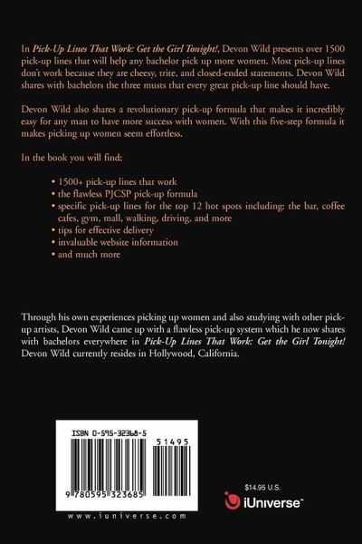 In Pick-Up Lines That Work: Get the Girl Tonight!, Devon Wild presents over 1500 pick-up lines that will help any bachelor pick up more women. Most pick-up lines don't work because they are cheesy, trite, and closed-ended statements. Devon Wild shares with bachelors the three musts that every great pick-up line should have. Devon Wild also shares a revolutionary pick-up formula that makes it incredibly easy for any man to have more success with women. With this five-step formula it makes picking up women seem effortless. In the book you will find: 1500+ pick-up lines that work the flawless PJCSP pick-up formula specific pick-up lines for the top 12 hot spots including: the bar, coffee cafes, gym, mall, walking, driving, and more tips for effective delivery invaluable website information and much more