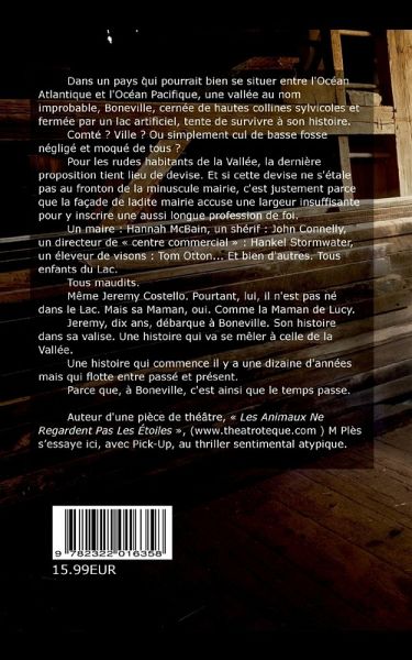Dans un pays qui pourrait bien se situer entre l'Océan Atlantique et l'Océan Pacifique, une vallée au nom improbable, Boneville, cernée de hautes collines sylvicoles et fermée par un lac artificiel, tente de survivre à son histoire.Comté ? Ville ? Ou simplement cul de basse fosse négligé et moqué de tous ?Pour les rudes habitants de la Vallée, la dernière proposition tient lieu de devise. Et si cette devise ne s'étale pas au fronton de la minuscule mairie, c'est justement parce que la façade de ladite mairie accuse une largeur insuffisante pour y inscrire une aussi longue profession de foi.Un maire : Hannah McBain, un shérif : John Connelly, un directeur de « centre commercial » : Hankel Stormwater, un éleveur de visons : Tom Otton... Et bien d'autres. Tous enfants du Lac.Tous maudits.Même Jeremy Costello. Pourtant, lui, il n'est pas né dans le Lac. Mais sa Maman, oui. Comme la Maman de Lucy.Jeremy, dix ans, débarque à Boneville. Son histoire dans sa valise. Une histoire qui va se mêler à celle de la Vallée.Une histoire qui commence il y a une dizaine d'années mais qui flotte entre passé et présent.Parce que, à Boneville, c'est ainsi que le temps passe.