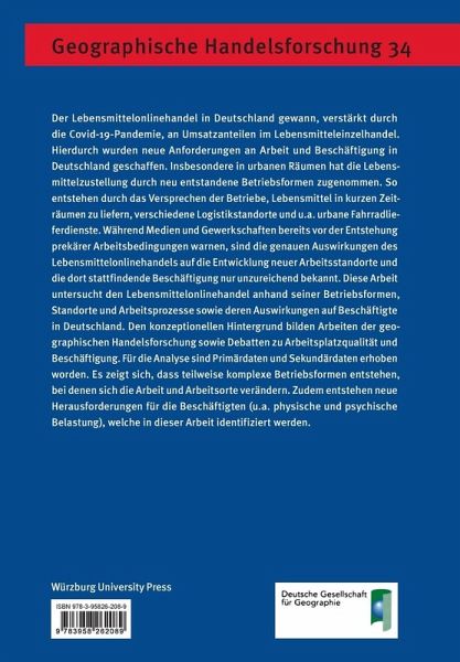 Der Lebensmittelonlinehandel in Deutschland gewann, verstärkt durch die Covid-19-Pandemie, an Umsatzanteilen im Lebensmitteleinzelhandel. Hierdurch wurden neue Anforderungen an Arbeit und Beschäftigung in Deutschland geschaffen. Insbesondere in urbanen Räumen hat die Lebensmittelzustellung durch neu entstandene Betriebsformen zugenommen. So entstehen durch das Versprechen der Betriebe, Lebensmittel in kurzen Zeiträumen zu liefern, verschiedene Logistikstandorte und u.a. urbane Fahrradlieferdienste. Während Medien und Gewerkschaften bereits vor der Entstehung prekärer Arbeitsbedingungen warnen, sind die genauen Auswirkungen des Lebensmittelonlinehandels auf die Entwicklung neuer Arbeitsstandorte und die dort stattfindende Beschäftigung nur unzureichend bekannt. Diese Arbeit untersucht den Lebensmittelonlinehandel anhand seiner Betriebsformen, Standorte und Arbeitsprozesse sowie deren Auswirkungen auf Beschäftigte in Deutschland. Den konzeptionellen Hintergrund bilden Arbeiten der geographischen Handelsforschung sowie Debatten zu Arbeitsplatzqualität und Beschäftigung. Für die Analyse sind Primärdaten und Sekundärdaten erhoben worden. Es zeigt sich, dass teilweise komplexe Betriebsformen entstehen, bei denen sich die Arbeit und Arbeitsorte verändern. Zudem entstehen neue Herausforderungen für die Beschäftigten (u.a. physische und psychische Belastung), welche in dieser Arbeit identifiziert werden.