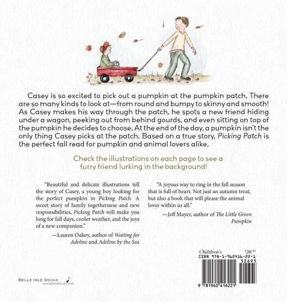 Casey is so excited to pick out a pumpkin at the pumpkin patch. There are so many kinds to look at-from round and bumpy to skinny and smooth! As Casey makes his way through the patch, he spots a new friend hiding under a wagon, peeking out from behind gourds, and even sitting on top of the pumpkin he decides to choose. At the end of the day, a pumpkin isn't the only thing Casey picks at the patch. Based on a true story, Picking Patch is the perfect fall read for pumpkin and animal lovers alike. Check the illustrations on each page to see a furry friend lurking in the background!