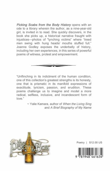 Picking Scabs from the Body History, opens with an ode to a library wherein a nine-year-old girl is invited in to read. She quickly discovers, in the book she picks up (We Charge Genocide: The Crime of Government Against the Negro People), a historical narrative fraught with injustices that "bristles the hair on my fearful arms," and sees photos of "lynching victims" and "treed men swing with hung heads/ mouths stuffed full." Poems in the collection exposes the dark underbelly of history-the sore spots or scabs of history. There is a poem relating another genocide-this time of the American…mehr