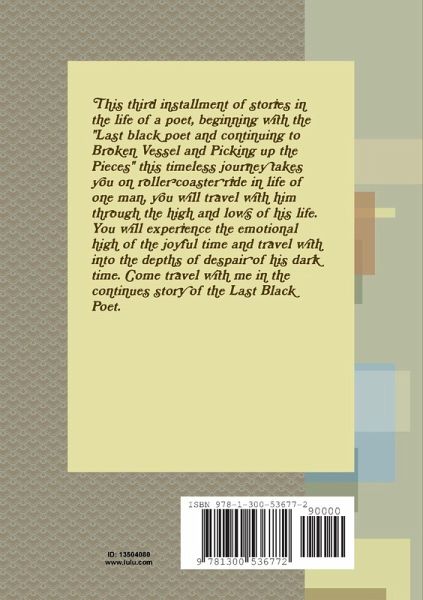This third installment of stories about the life of poet beginning with the "Last black poet and continuing to Broken Vessel and Picking up the Pieces" this timeless journey takes you on roller-coaster ride in life of one man, you will travel with him through the high and lows of his life. You will experience the emotional high of the joyful time and travel with into the depths of despair of his dark time. Come travel with me in the continues story of the Last Black Poet.
